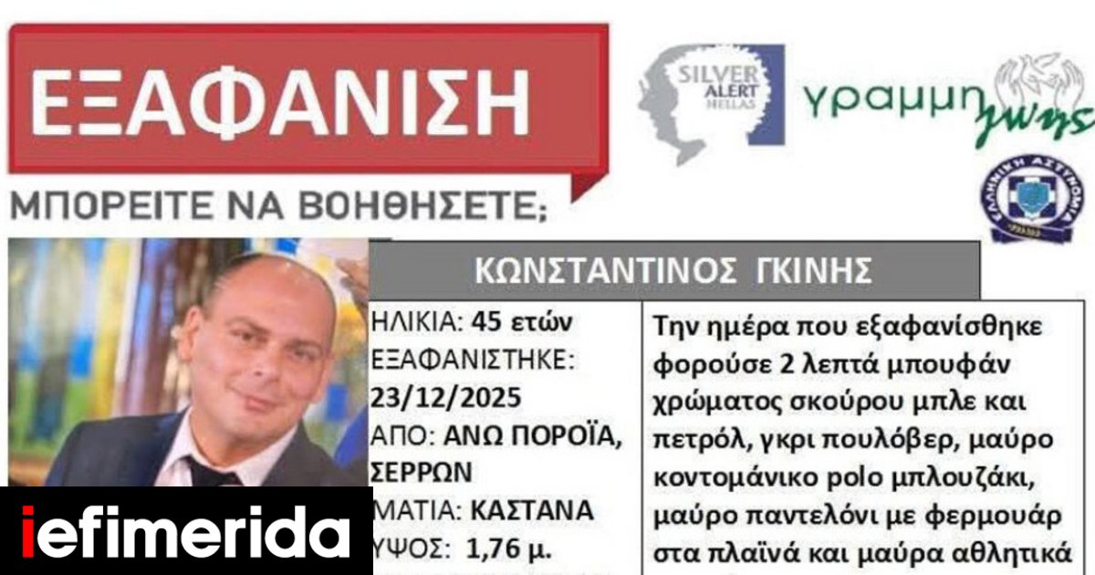 Συναγερμός έχει σημάνει στις Σέρρες από χθες το πρωί (23/12/2025) μετά την εξαφάνιση του διοικητή του Πυροσβεστικού Κλιμακίου Πορροΐων, Κωνσταντίνου
