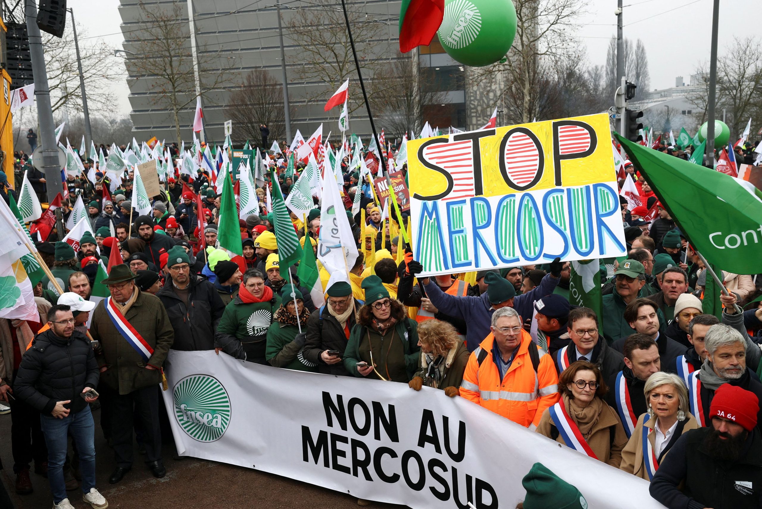 Κρατώντας σημαίες και αναμμένα καπνογόνα, χιλιάδες αγρότες διαδήλωσαν σήμερα έξω από την έδρα του Ευρωπαϊκού Κοινοβουλίου στο Στρασβούργο, διαμαρτυρόμενοι για τη συμφωνία της ΕΕ με τη Mercosur, παρ