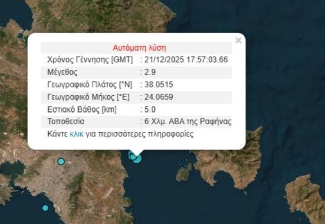 Δύο σεισμοί μέσα σε λίγα λεπτά σημειώθηκαν το βράδυ της Κυριακής 21 Δεκεμβρίου 2025 ανοιχτά της Ραφήνας. Οι σεισμικές δονήσεις έγιναν αισθητές σε πολλές