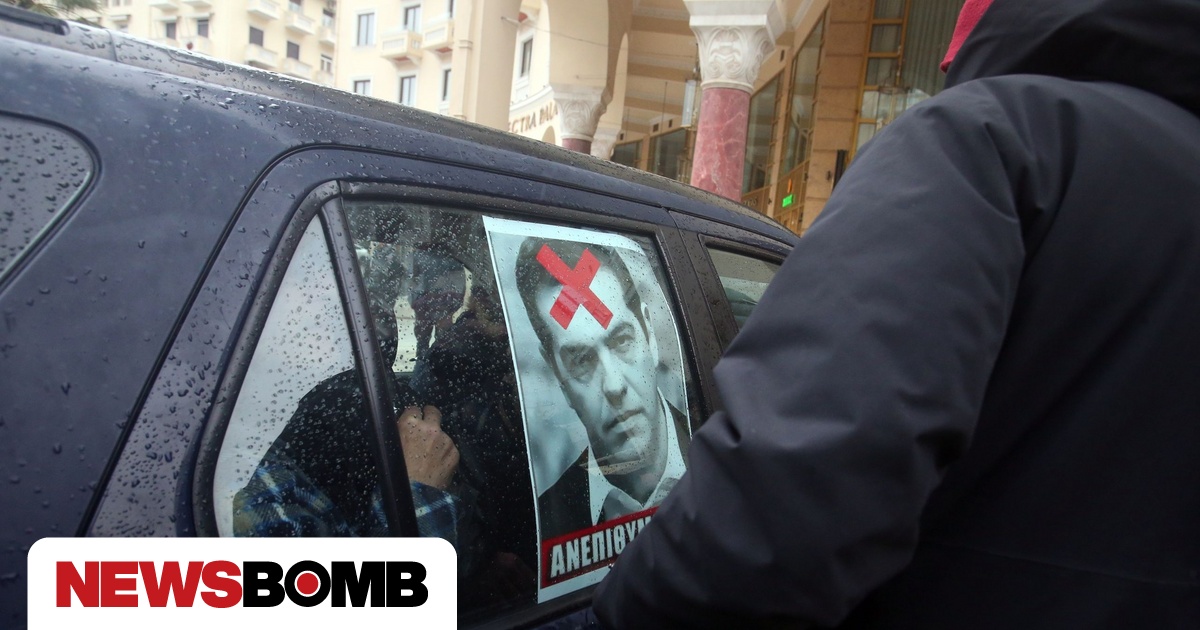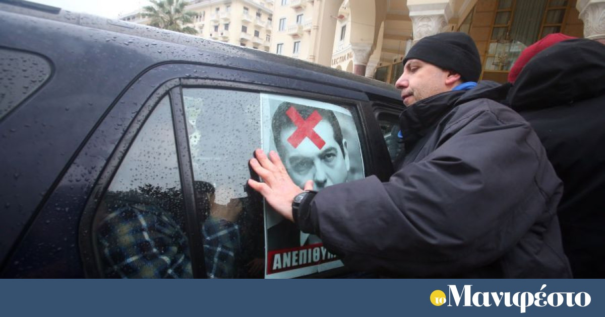 Οι συγκεντρωμένοι πέταξαν τρικάκια με τη φωτογραφία του κ. Τσίπρα και τη λέξη «ανεπιθύμητος»