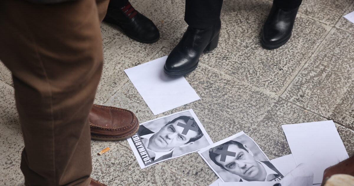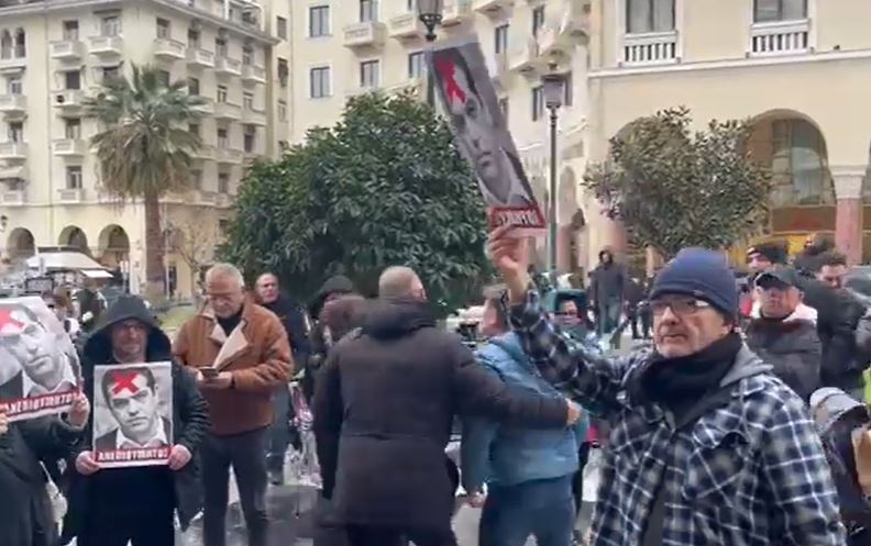 Ομάδα ατόμων από τους Ενωμένους Μακεδόνες κρατούσε πλακάτ με τη φωτογραφία του πρώην πρωθυπουργού και τη λέξη «Ανεπιθύμητος»