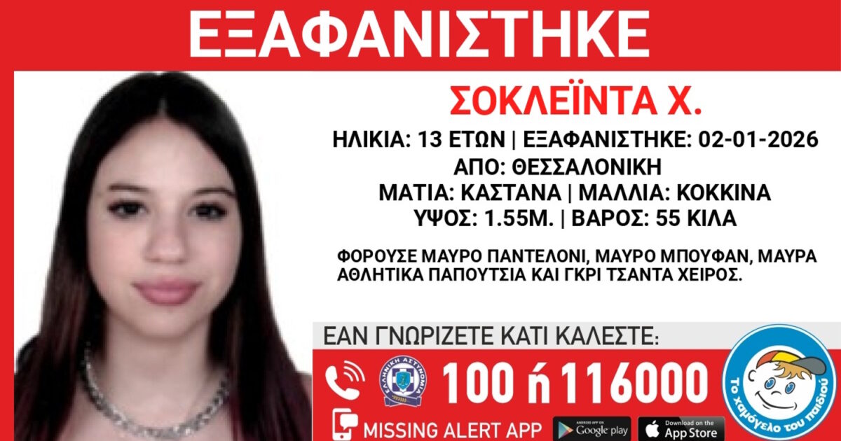 Η ανακοίνωση του «Χαμόγελου του Παιδιού» Συναγερμός σήμανε στις αρχές για την εξαφάνιση της 13χρονης Σοκλέϊντα Χ. από δομή φιλοξενίας στη Θεσσαλονίκη, το βράδυ της Παρασκευής 2 Ιανουαρίου. Η ανακοίνωση του «Χαμόγελου του Παιδιού» Το «Χαμόγελο του Παιδιού» ενημερώθηκε σήμερα, 23/01/2026 για την εξαφάνισή της και προχώρησε στη δημοσιοποίηση των στοιχείων της ανήλικης κατόπιν εισαγγελικής […]