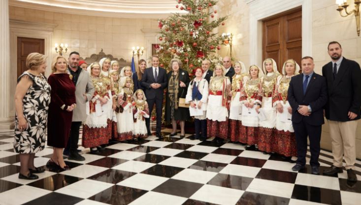 Μέσα στο γιορτινό σκηνικό της παραμονής της Πρωτοχρονιάς, ο πρωθυπουργός Κυριάκος Μητσοτάκης υποδέχθηκε στο Μέγαρο Μαξίμου μέλη της Ένωσης Λιοσιωτών Ιλίου, ακούγοντας τα παραδοσιακά κάλαντα.