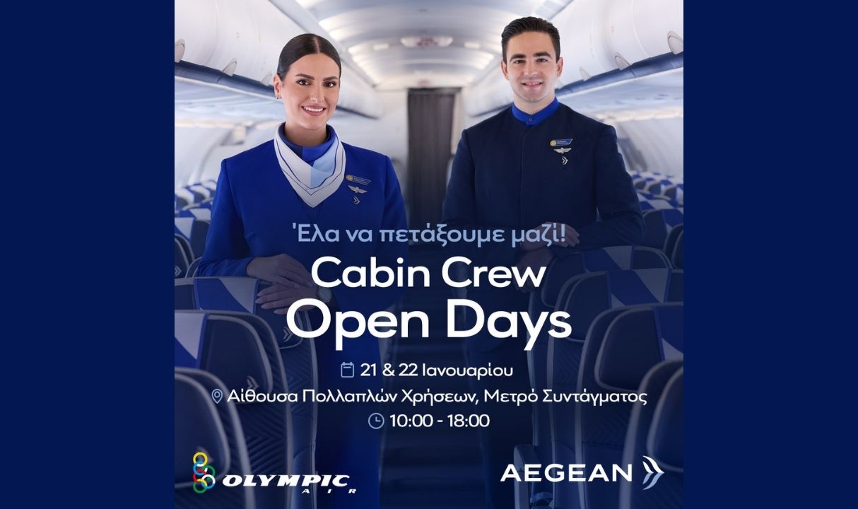 Η AEGEAN διοργανώνει Open Days στην Αθήνα την Τετάρτη 21 και την Πέμπτη 22 Ιανουαρίου 2026 στην Αίθουσα Πολλαπλών Χρήσεων του Μετρό Συντάγματος, στο πλαίσιο της περαιτέρω στελέχωσης των πληρωμάτων καμπίνας.