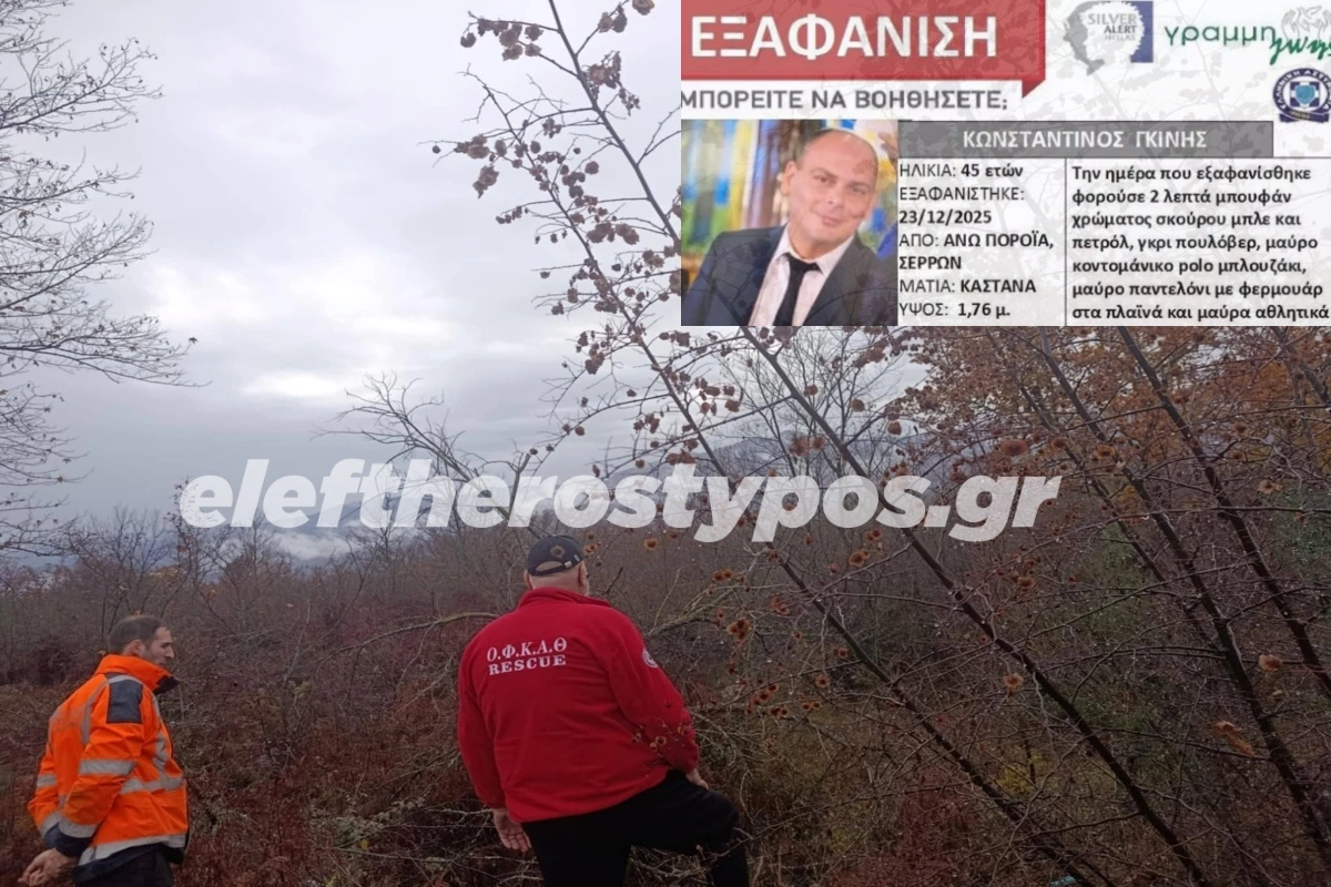 Σε θρίλερ εξελίσσεται η εξαφάνιση του Κωνσταντίνου Γκίνη, διοικητή του Πυροσβεστικού Κλιμακίου Ποροΐων, τα ίχνη του οποίου χάθηκαν το πρωί της Τρίτης 23 Δεκεμβρίου 2025. Για τρίτη συνεχόμενη ημέρα χθες, δεκάδες πυροσβέστες, αστυνομικοί, εθελοντές και ειδικά κλιμάκια «χτενίζουν» δύσβατες περιοχές στις Σέρρες, με το βλέμμα στραμμένο κυρίως στο όρος Μπέλλες και τα Κρούσια, χωρίς μέχρι […]